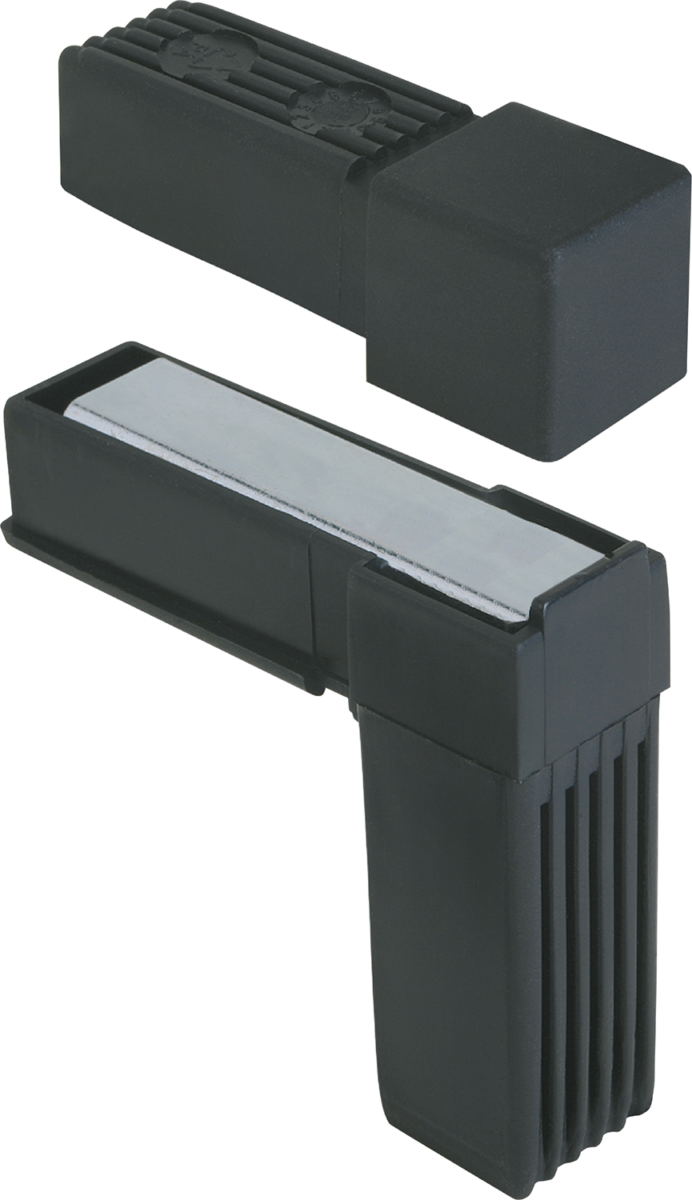Stecksystem ohne Schrauben. Die Steckverbinder werden einfach in das entsprechende Vierkantrohr eingesteckt. Demontierbar und mehrfach wiederverwendbar.